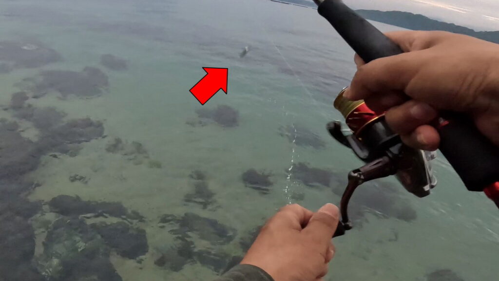 かなり手前でちょんちょんとエギを跳ね上げ、