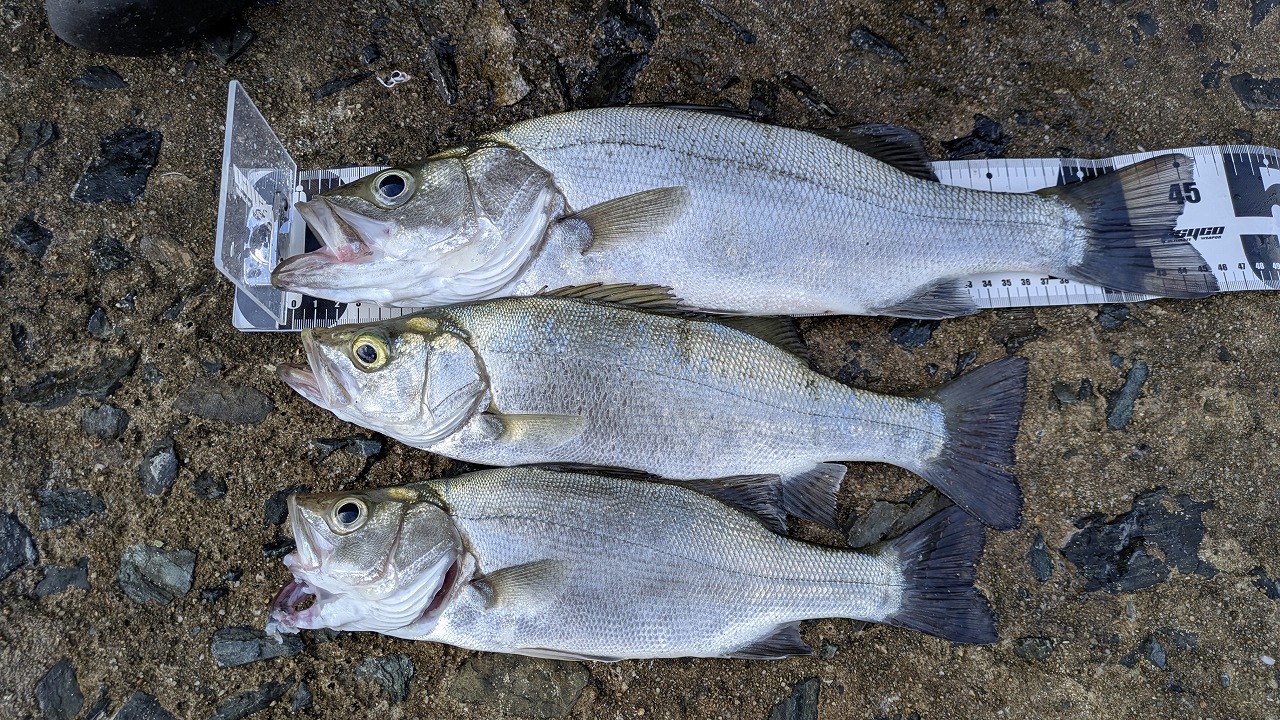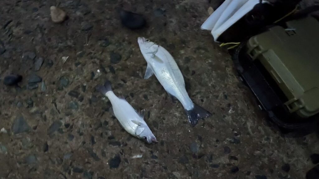 釣り上げられ無造作に置かれたヒラセイゴが7匹!