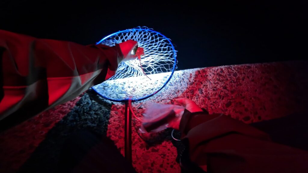 手前の海面を照らす簡易の集魚灯を設置しましたが、