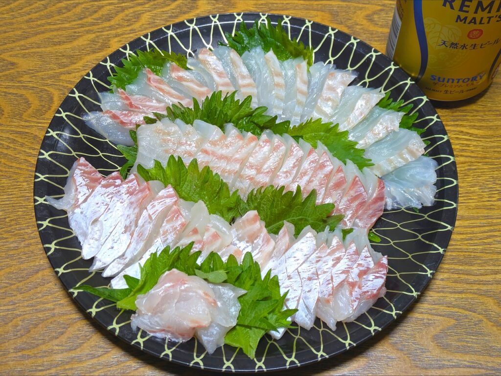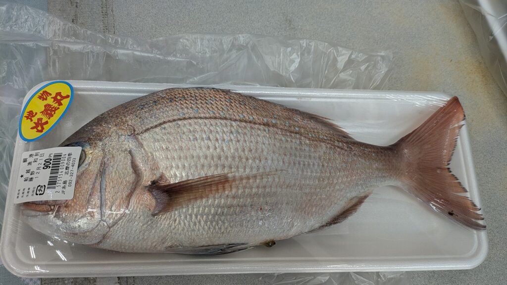 ヒラセイゴ、ブリ、アジ、真鯛、タチウオ、アオリイカ、その他沢山の魚が並んでいました。