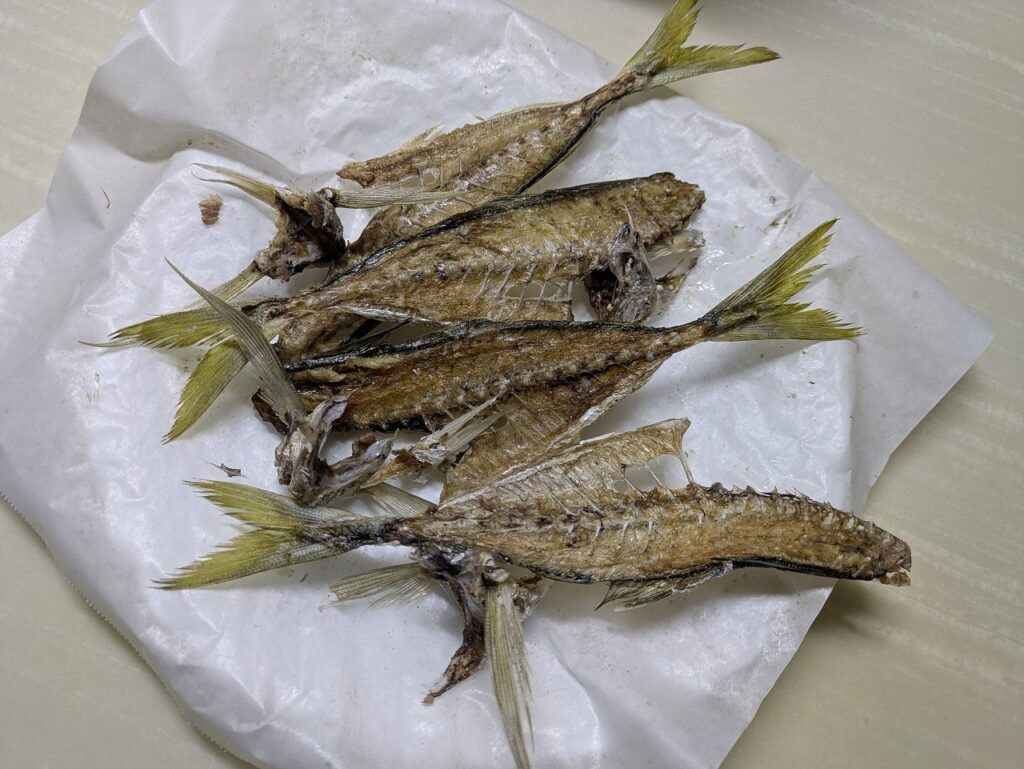 アジの中骨とカマをレンチンしてパリッパリに仕上げた