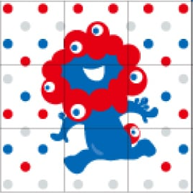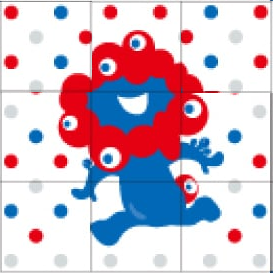このミャクミャクのキューブを揃えるために、 ほとんどの方は、 ミャクミャク本体と背景の色に焦点あてて揃えようとすると思いますが、 正しいパーツを判断するためのもう一つのヒントが ドットの色と配列 になります。 灰色背景面のドットは大したヒントにはなりませんが 色ドット背景面ではかなり良いヒントになります。 上から赤・灰・青の順番で横一直線に並んでいます。 また、上段パーツには上に2個の赤ドット 下段の足元は2個の灰ドット これも判別の材料になります。