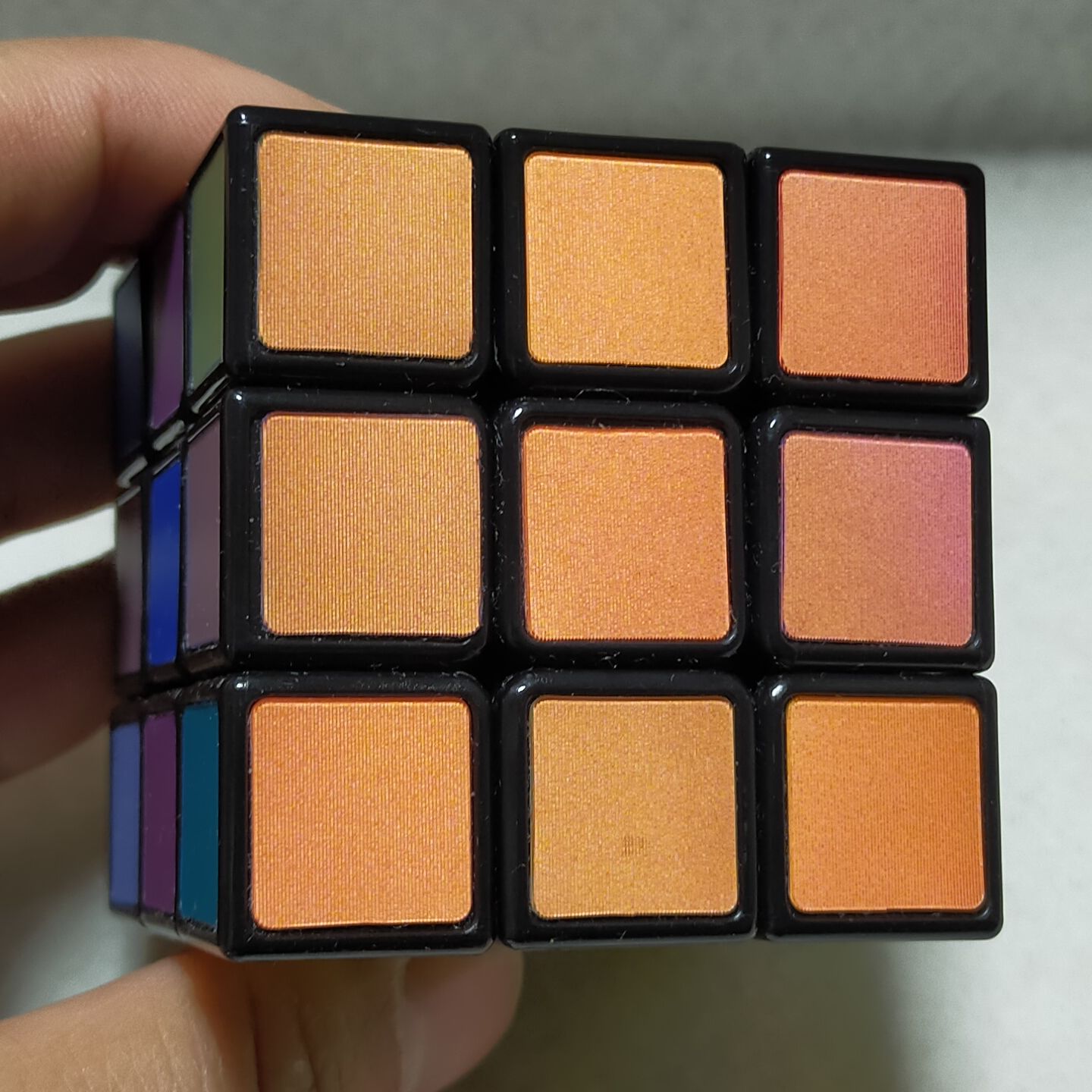 ・ルービックキューブインポッシブルの特徴 買ってすぐの新品の状態のキューブは6面完成している状態ですが、まったく揃っているようには見えません。 ![]() (これで全面揃っているのです) 特徴1: ほとんどのパネル(色付きのシール)は、 見る角度によって「白黄」「青橙」のように2色に見えます。 センターキューブは全て1色固定で エッジ・コーナーキューブにも一部1色のパネルがあります。 ![]() 黄面はエッジキューブの1つが1色固定です。 特徴2: 全てのパネルには、見にくいですが細い溝がいくつも平行に入っており、 それによって見る角度により2色に見える仕組みです。 ![]() (昭和の時代、下敷きや筆箱等の文具の表面にこの仕組みのものがあって、 角度を変えると絵が動いて見えるヤツがありましたね。懐かしい・・・) この細い溝が正しい色を特定するヒントになるのですが、 50代の老眼の私にその溝は、ほぼほぼ見えません。。。←(2023年現在) が、 老眼の皆様、ご安心ください! 溝に沿って指でパネルをなぞると「ツルン!」とした触り心地で、 溝に対して横方向からなぞると「ザラッ」とした感触です。 目で見えない分、触感で判別できまーす(^-^) 全て揃った状態でこの溝を確認すると以下のようになります。 白面を上、黄面を下、赤面を正面になるように持つと、 ![]() 溝はこのような方向に入っています。 この溝の入り方で正しい色を特定できる場合があります。 (後ほど詳しく説明します) ※中央の溝は揃え直すことで90度ズレる場合があります。 特徴3: 各面はある角度に傾けると全て揃って見えますが、 色によって全て揃って見える角度が微妙に違います。 特徴2で説明したように、 白面を上、黄面を下になるように持った場合 例えば赤面は真正面に近い状態で全て赤に見えます。 ![]() 青面は少し左に傾けると全てが青に見えますし、 ![]() 橙面は逆に少し右に傾けると全て同じ色に見えます。 ![]() 緑面は左右どちらか30度ぐらい傾けると全て同じ色に見えます。 ![]() ※部屋の照明の位置によって見え方に違いがあります。 照明が明るい方がしっかり色が揃っているよう見えます。 赤面を上、橙面を下になるように持った場合 白面はほぼ正面で揃って見え、 ![]() 黄面は角度をつけると揃って見えます。 ![]() 以上3つの特徴で正しい色の特定し、 6面完成を目指します。 ・各キューブの色の特定方法 様々な色に見えるキューブも ほとんどのキューブで正しい色を特定することが出来ます。 当然ながら、1色のパネルはその色で確定でOKです。 1番分かりやすいのは、「白赤緑」のコーナーキューブです。 ![]() これだけは3つのパネル全てが1色で固定されています。 2色に見えるパネルのどちらが正しいのか?を特定するには 前節で書いているように、 世界配色と各パネルに入った細い溝で判別していきます。 例をあげて説明します。 まず前提として、6面完成状態での 世界配色・溝の方向は以下の通りです。