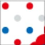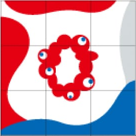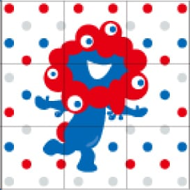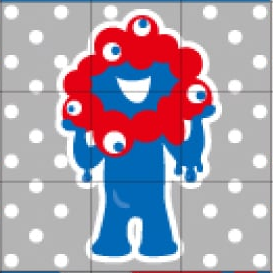 このミャクミャクのキューブを揃えるために、 ほとんどの方は、 ミャクミャク本体と背景の色に焦点あてて揃えようとすると思いますが、 正しいパーツを判断するためのもう一つのヒントが ドットの色と配列 になります。 灰色背景面のドットは大したヒントにはなりませんが 色ドット背景面ではかなり良いヒントになります。 上から赤・灰・青の順番で横一直線に並んでいます。 また、上段パーツには上に2個の赤ドット 下段の足元は2個の灰ドット これも判別の材料になります。