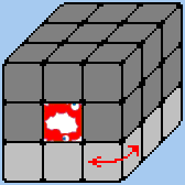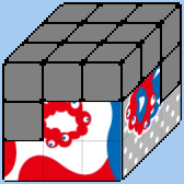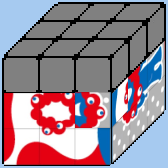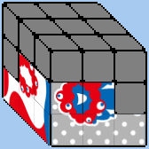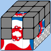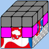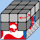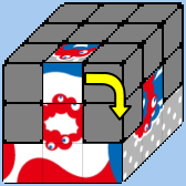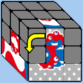 細胞面の中央が見つかったら、 最初に揃えた色ドット左向き面を回転させ 細胞面の側面中央と側面1段目の絵柄を合わせて 下図のようにします。